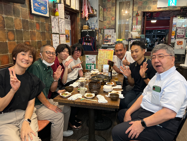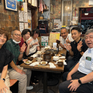 「集合写真は、江戸川支部の校友の皆さまがご来店くださった際に撮影したものです。右側中央に写っているのが代表の高橋です。母が創業したこの店を、2020年に引き継ぎ現在も大切に営んでおります。」